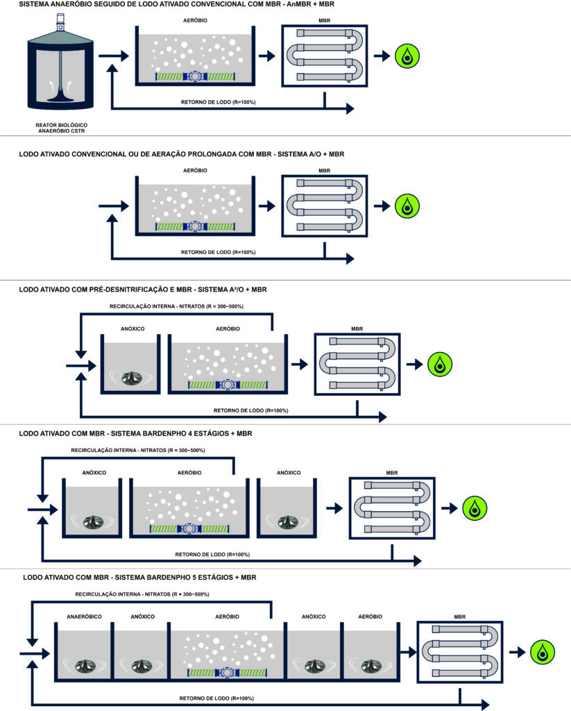 d) Lodo Ativado com MBR – Sistema Bardenpho 5 Estágios + MBR: Integra cinco zonas de reação (anaeróbia, anóxica, aeróbia, anóxica, aeróbia) seguidas de separação por MBR. Permite a remoção biológica simultânea de nitrogênio e fósforo, alcançando efluentes de padrão de reuso. A recirculação interna de nitratos (300–500%) garante desnitrificação eficiente e baixo teor residual de nutrientes. Ideal para estações de alta performance, reúso industrial e tratamento avançado de efluentes complexos.